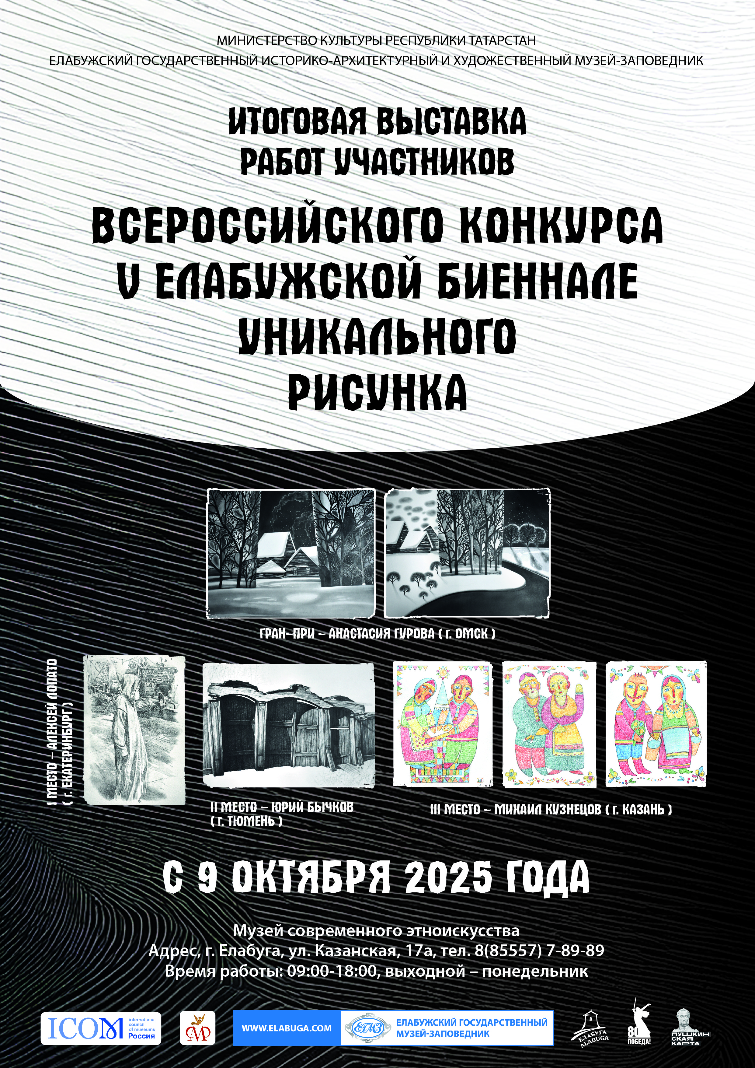 9 октября в Музее современного этноискусства начала работу итоговая выставка работ участников Всероссийского конкурса «V Елабужская биеннале уникального рисунка». Его цель – популяризация и дальнейшее развитие традиционного классического рисунка, повышение уровня современного рисунка в России. Об этом сообщает пресс-служба Елабужского музея-заповедника.