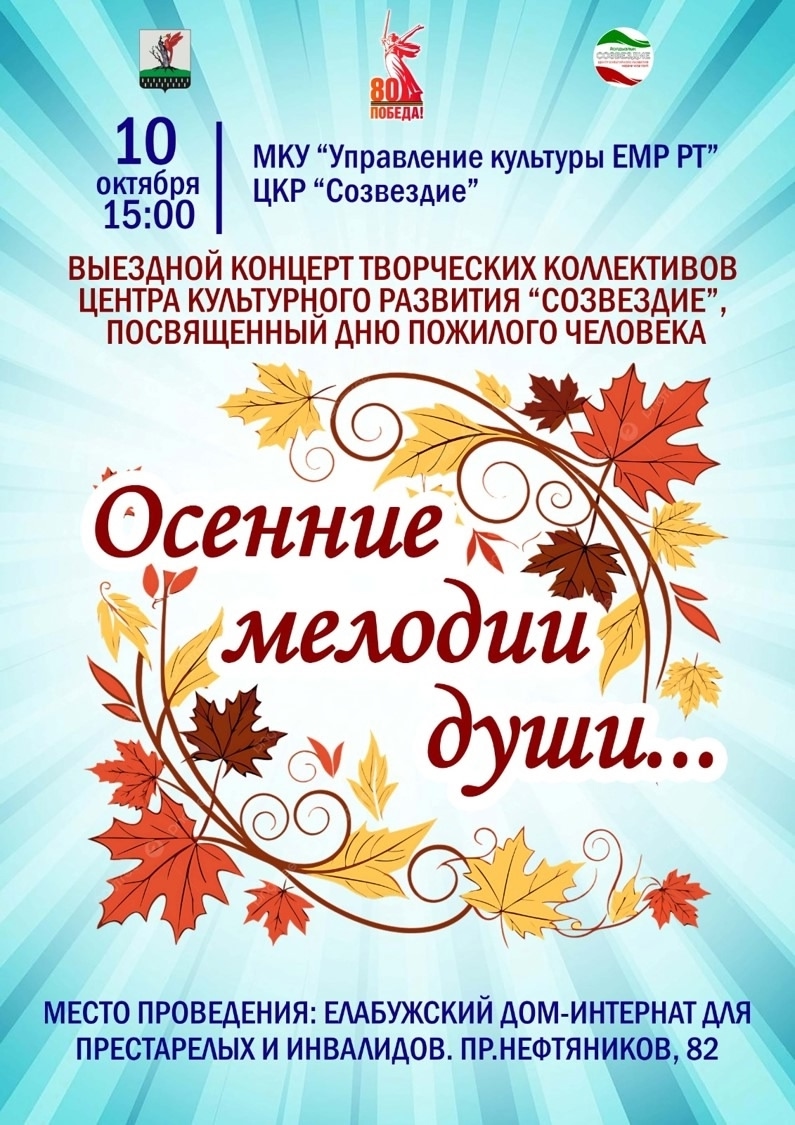 10 октября в 15.00 в елабужском доме-интернате состоится прекрасный концерт, посвященный Дню пожилого человека. Свою программу представят творческие коллективы Центра культурного развития "Созвездие". Приглашаем всех желающих послушать прекрасные мелодии и провести вечер с пользой.