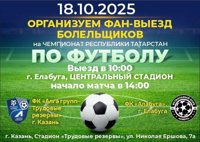 18 октября организуют Фан-выезд болельщиков на Чемпионат РТ по футболу. В Казани сыграют команды "Алга-групп Трудовые резервы" и ФК "Алабуга". Начало матча 18 октября в 14.00 Приглашаем поддержать любимые команды и насладится зрелищным видом спорта.