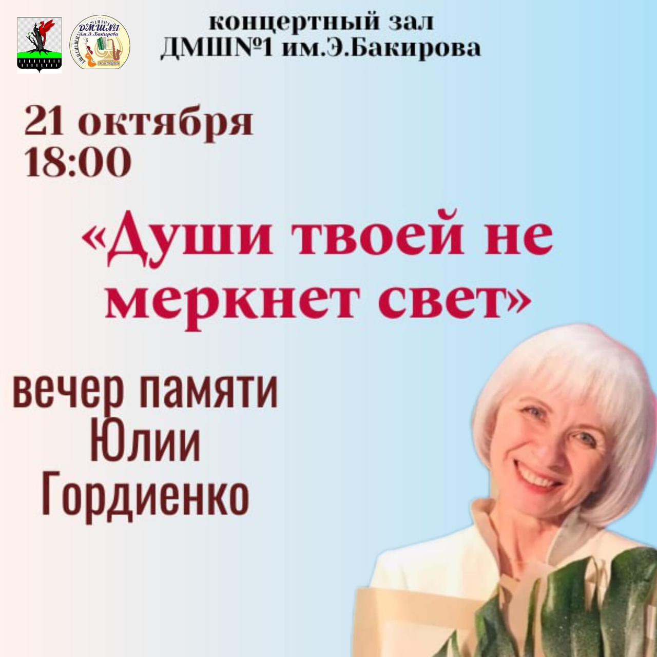 21 октября в 18:00 в ДМШ №1 им. Э. Бакирова состоится вечер памяти преподавателя теоретических дисциплин Гордиенко Ю.Р., безвременно ушедшей от нас.