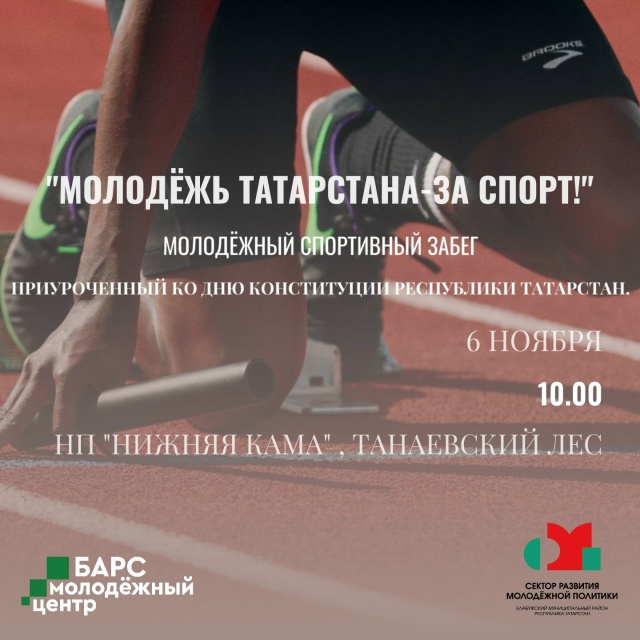 Молодежный центр "Барс" приглашает Вас принять участие в крутом спортивном событии – молодежном забеге "Молодежь Татарстана – за спорт!".