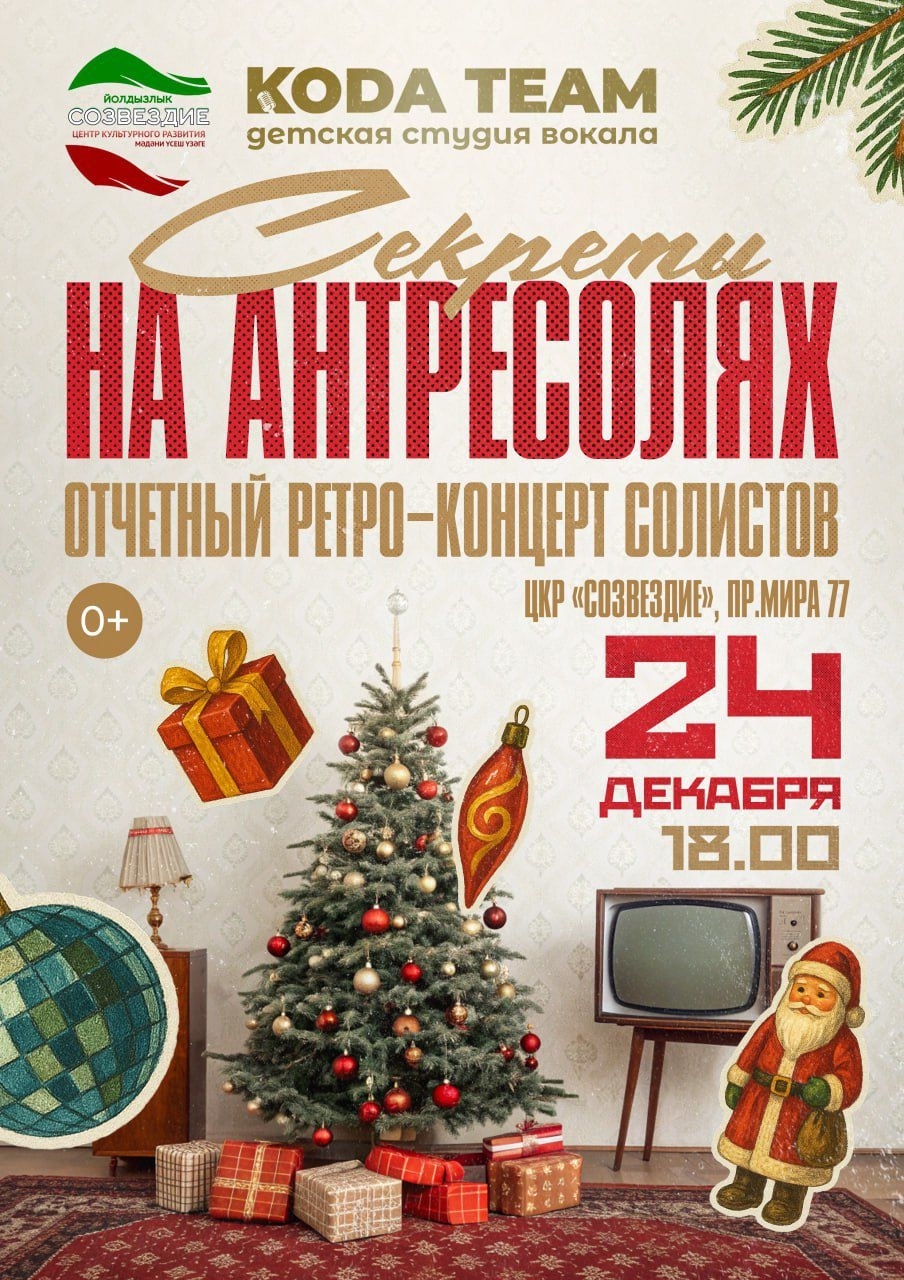 Зимний отчетный ретро-концерт солистов студии KODA TEAM «Секреты на антресолях». Гости концерта погрузятся в волшебную атмосферу эпохи, когда царили диско и поп-рок, а хиты звучали из каждого окна. В исполнении солистов студии зритель услышит самые любимые и знакомые песни 90-х и 2000-х годов — от легендарных поп-групп до проникновенных баллад, которые составляют саундтрек нашего детства и юности.