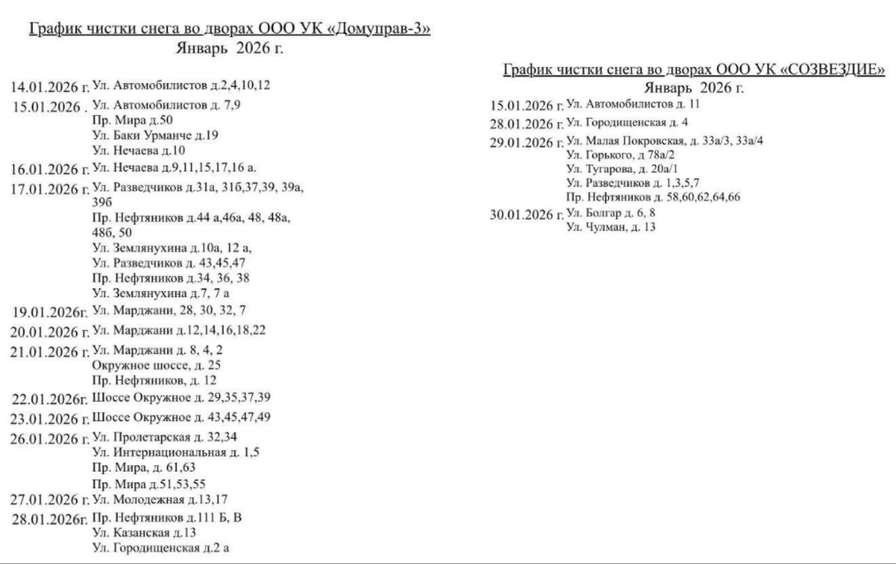 ООО УК «Домуправ-3» и ООО УК «Созвездие» представляют вашему вниманию график уборки внутридворовых территорий на январь 2026 года. Работы будут проводиться поэтапно и согласно утвержденному плану.