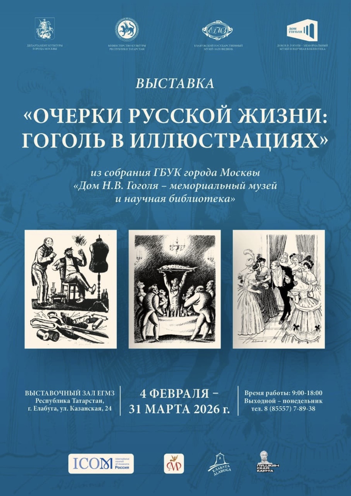 4 февраля в 15.00 часов в Выставочном зале Елабужского государственного музея-заповедника состоится открытие выставки «Очерки русской жизни: Гоголь в иллюстрациях» из собрания ГБУК города Москвы «Дом Н.В. Гоголя – мемориальный музей и научная библиотека».