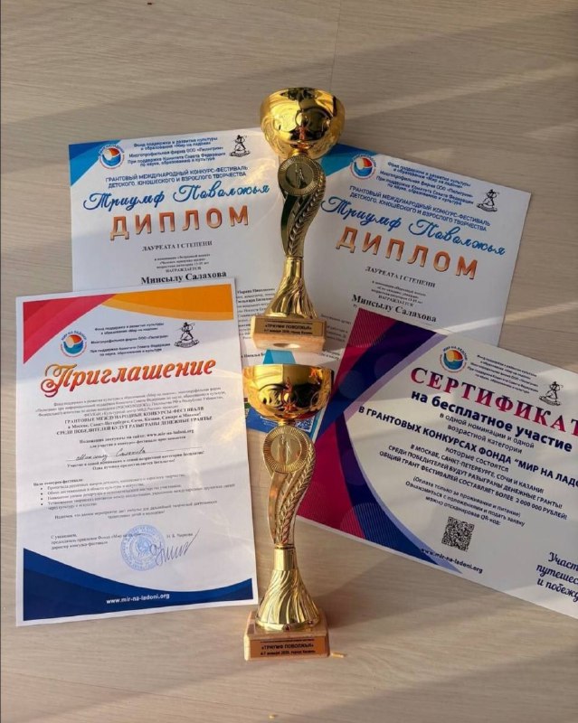 Минсылу стала лауреатом I степени на Грантовом международном конкурсе-фестивале детского, юношеского и взрослого творчества «Триумф Поволжья». Также она получила сертификат на бесплатное участие в грантовых конкурсах фонда «Мир на Ладони»!