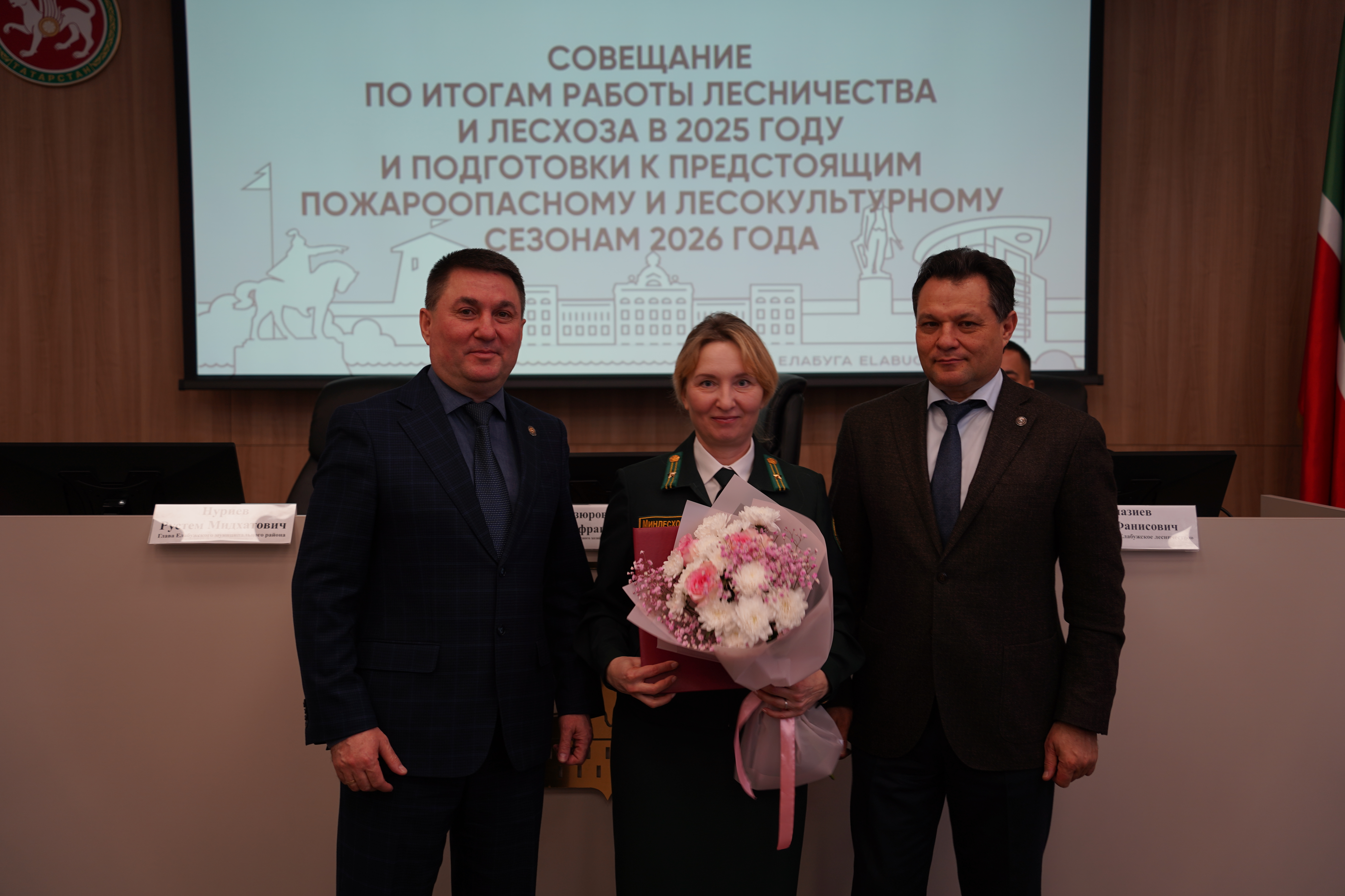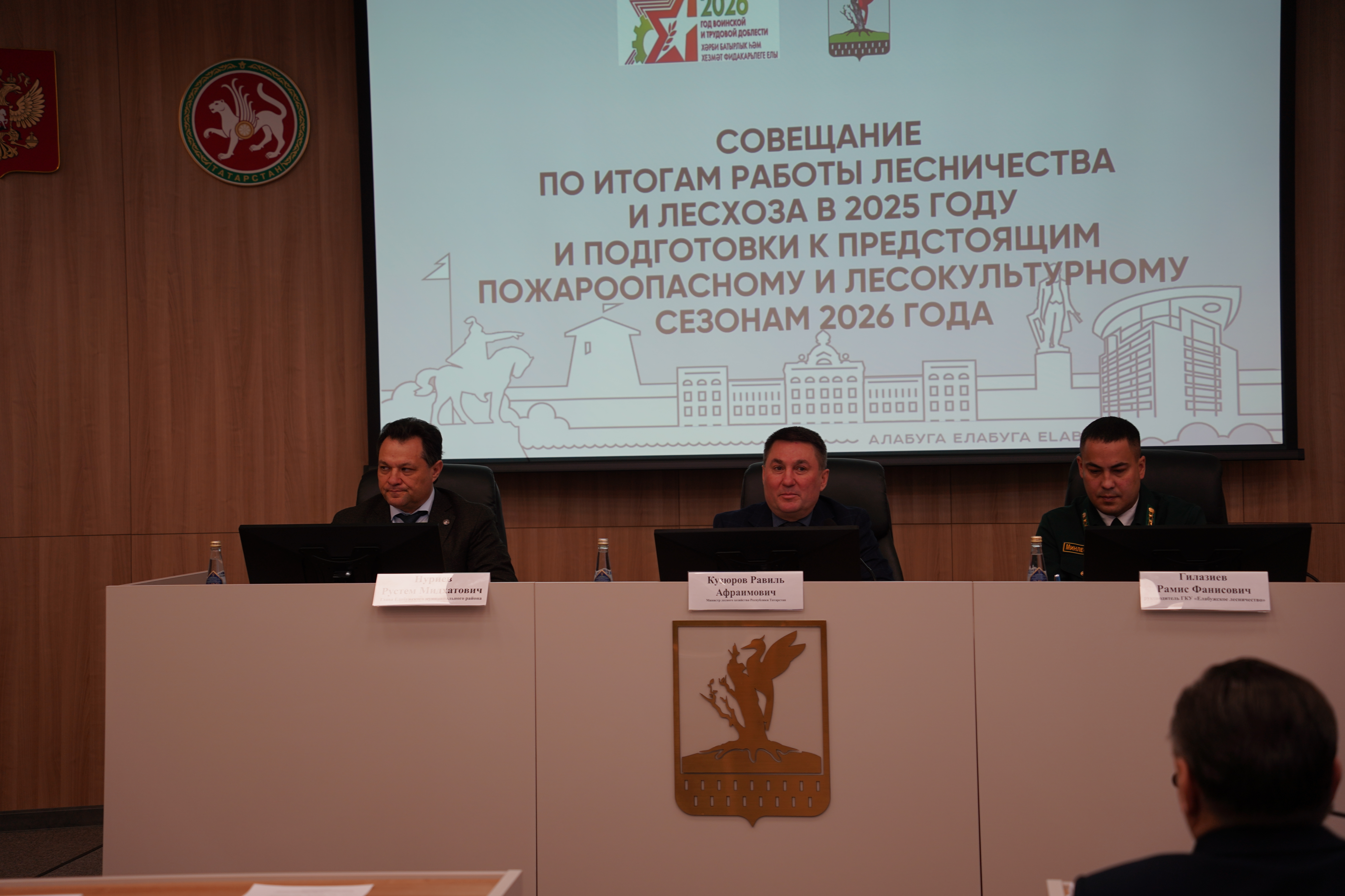 Сегодня в Елабуге состоялось совещание по итогам работы лесничества и лесхоза за 2025 год и подготовки к предстоящему пожароопасному и лесокультурному сезонам 2026 года. В совещании приняли участие Министр лесного хозяйства РТ Равиль Кузюров, глава Елабужского района Рустем Нуриев и руководитель Елабужского лесничества Рамис Гилазиев, а также представители лесхоза.