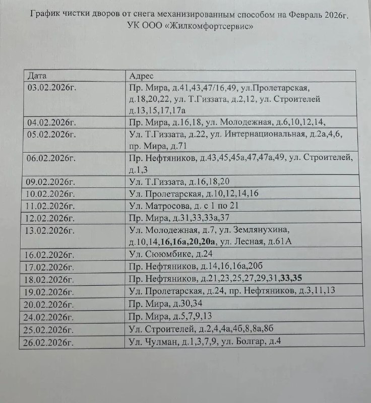 Управляющая компания ООО «Жилкомфортсервис» информирует жителей об утвержденном графике проведения уборочных работ на придомовых территориях в феврале 2026 года.