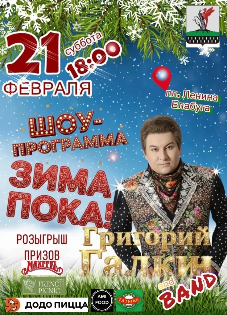 21 февраля в 18.00 приглашаем на праздник - "Зима- пока". Мероприятие состоится на площади Ленина. Для елабужан и гостей города подготовлена фееричная программа с выступлением Григория Галкина.