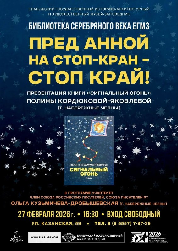 Дорогие друзья! 27 февраля в 16:30 Библиотека Серебряного века ЕГМЗ рада пригласить вас на увлекательную творческую встречу под названием «ПРЕД АННОЙ НА СТОП-КРАН – СТОП КРАЙ!». На встрече нас будет радовать поэтесса из Набережных Челнов Полина Кордюкова-Яковлева, которая представит свою новую книгу «Сигнальный огонь».