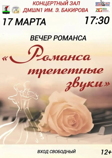 Детская музыкальная школа № 1 имени Э. Бакирова 17 марта в 17:30.приглашает всех ценителей вокального искусства на вечер романса - «Романса трепетные звуки».