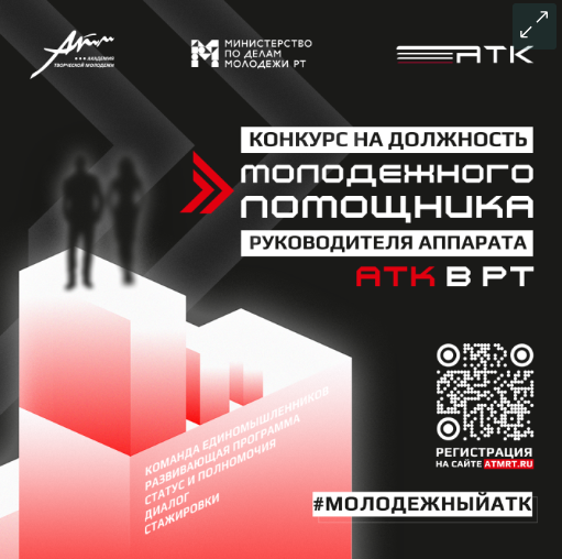 1. Республиканский конкурс на должность молодежного помощника руководителя апарата АТК в РТ Конкурс, позволяющий направить на обучение молодых людей, специалистов и заинтересованную в профилактике аудиторию, которые смогут проводить мероприятия по профилактике в районах и на местах. Подать заявку могут молодые люди от 18 до 35 лет.