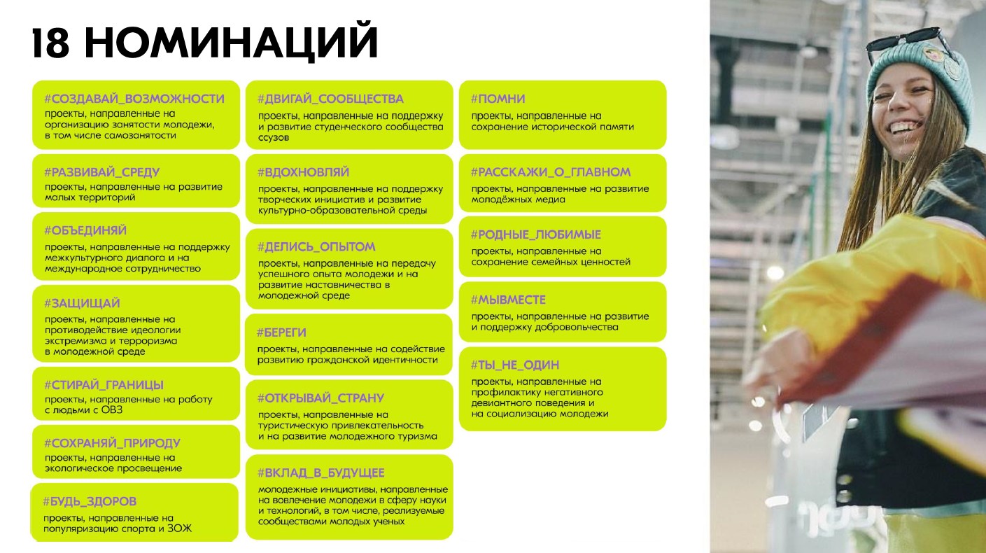 Сегодня конкурс снова открыт для молодых авторов социальных проектов - граждан России от 14 до 35 лет (включительно). Регистрация участников проходит на платформе «Молодежь России» до 15 апреля 2026 года. Максимальный размер гранта на поддержку идеи в этом сезоне составляет 1 миллион рублей. На конкурс можно представить не более одной заявки, содержащей один проект в одной из 18 номинации.