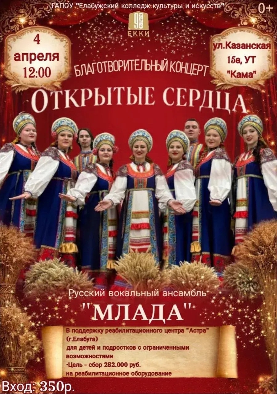 4 апреля в 12.00 приглашаем вас на доброе событие, которое способно изменить чью‑то жизнь к лучшему. В учебном театре «Кама» состоится благотворительный концерт в поддержку реабилитационного центра «Астра» - организации, помогающей детям и подросткам с ограниченными возможностями.