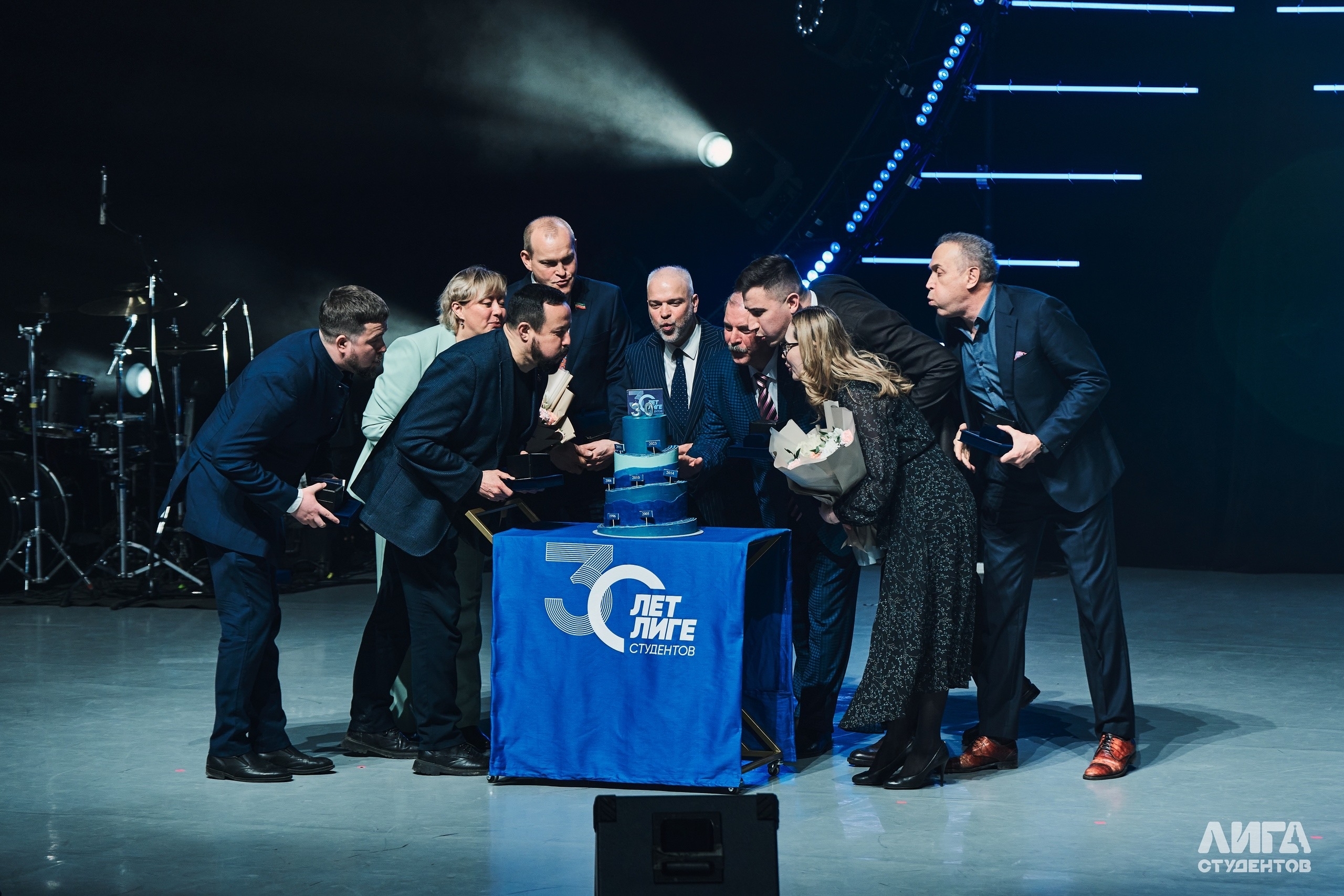 Символом преемственности поколений стал творческий номер с участием проректоров вузов. Кульминацией вечера- вынос юбилейного торта и исполнение гимна Лиги студентов.