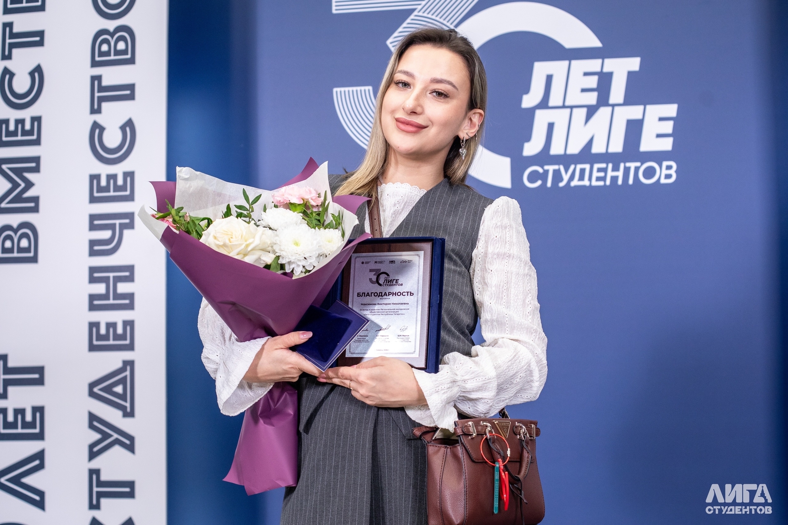 Почётную благодарность за вклад в развитие Региональной молодёжной общественной организации «Лига студентов Республики Татарстан» получила Виктория Максимова, директор Елабужского Молодёжного центра «Барс».