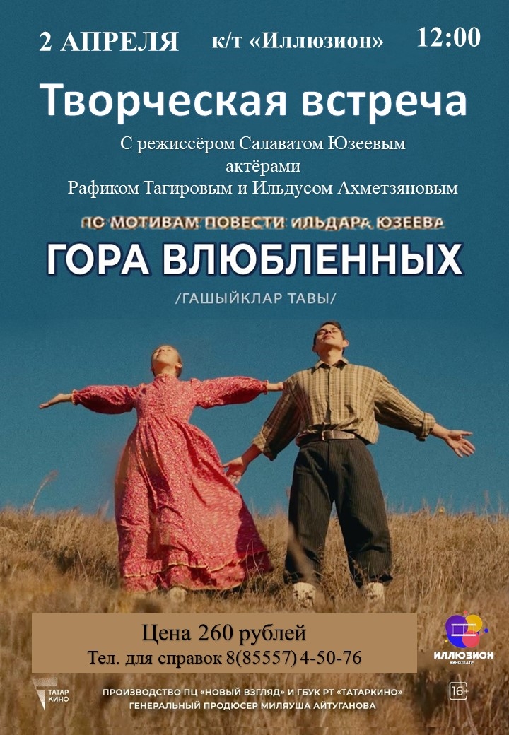 Поклонников кино ждёт незабываемое событие. 2 апреля в 12:00 в кинотеатре «Иллюзион» пройдёт уникальная творческая встреча с творцами фильма «Гора влюблённых». Гости мероприятия смогут пообщаться с режиссёром и сценаристом картины Салаватом Юзеевым, народным артистом Республики Татарстан и Заслуженным артистом Российской Федерации Ильдусом Ахметзяновым, а также познакомиться с народным артистом РТ Рафиком Тагировым. Это редкая возможность заглянуть за кулисы кинематографа и узнать, как рождалась лента.