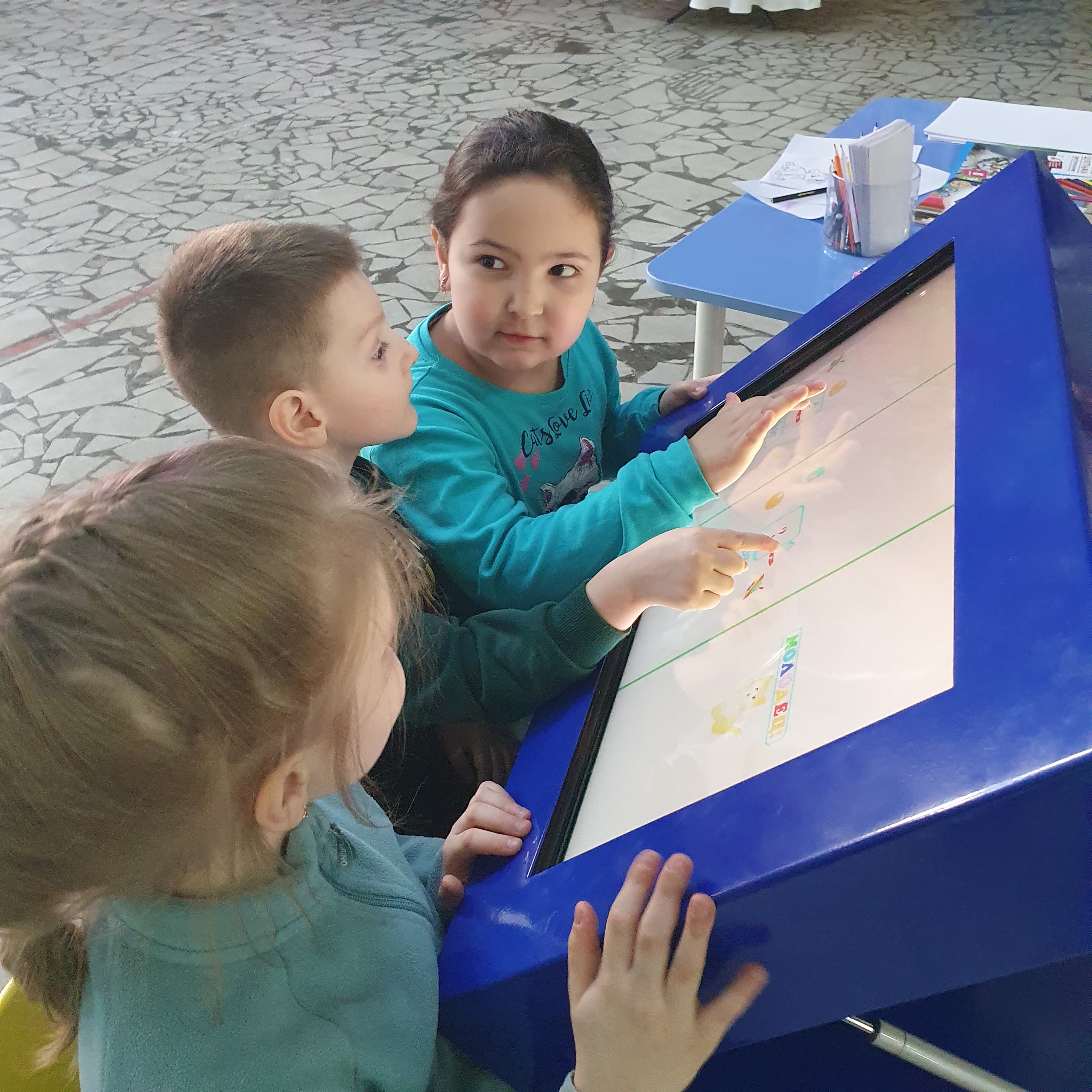 - Интерактивный стол с технологией мультитач — увлекательные командные игры, которые учат детей общаться, договариваться и эффективно работать в команде.