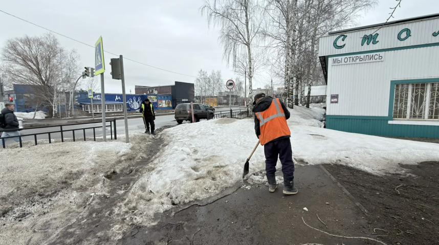 Кроме того, ведутся работы по уборке снега с тротуаров в нижней, исторической части города - на ул. Тугарова, ул. Г. Камала и в сквере Репрессированных (на улице Говорова).