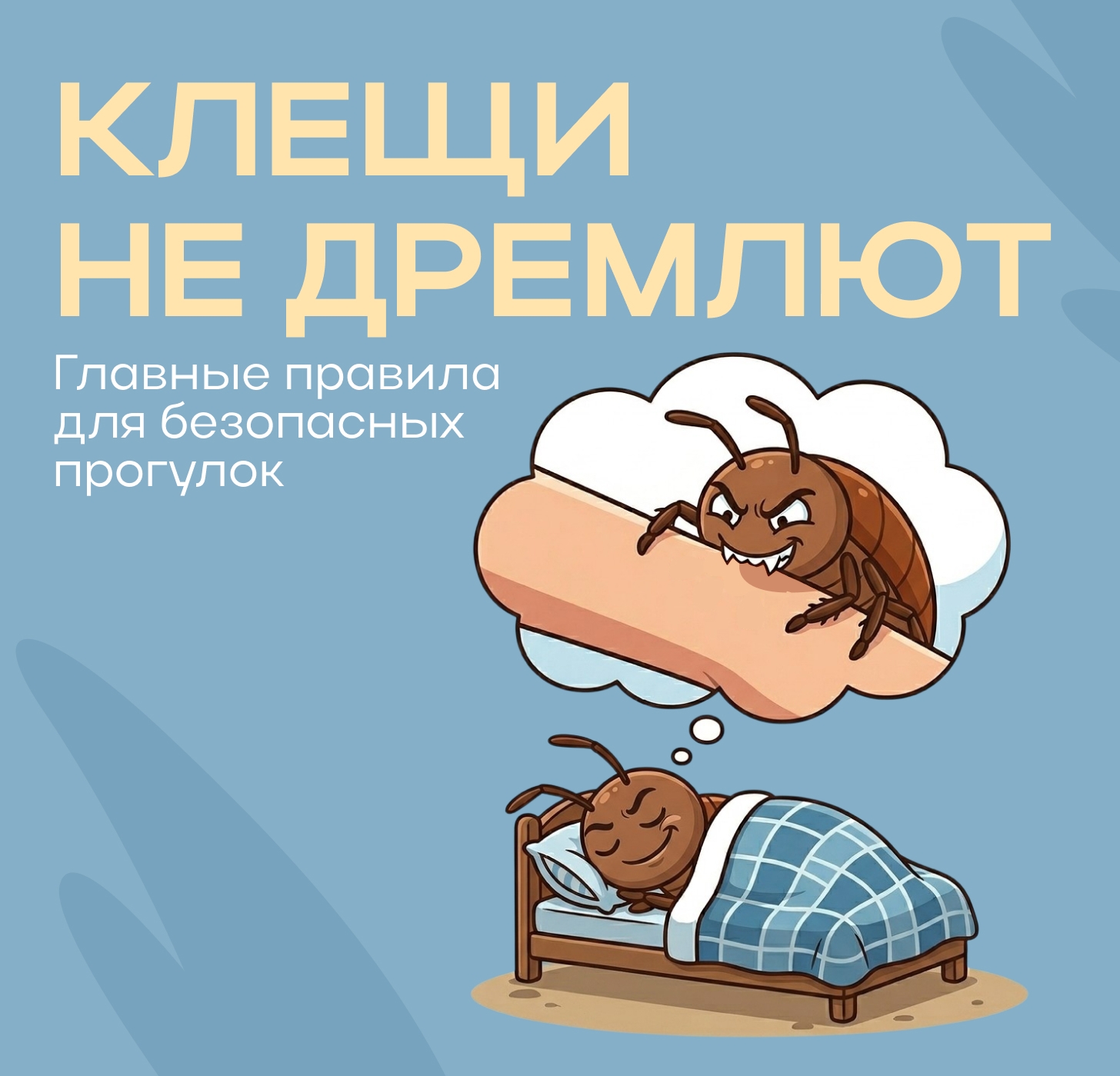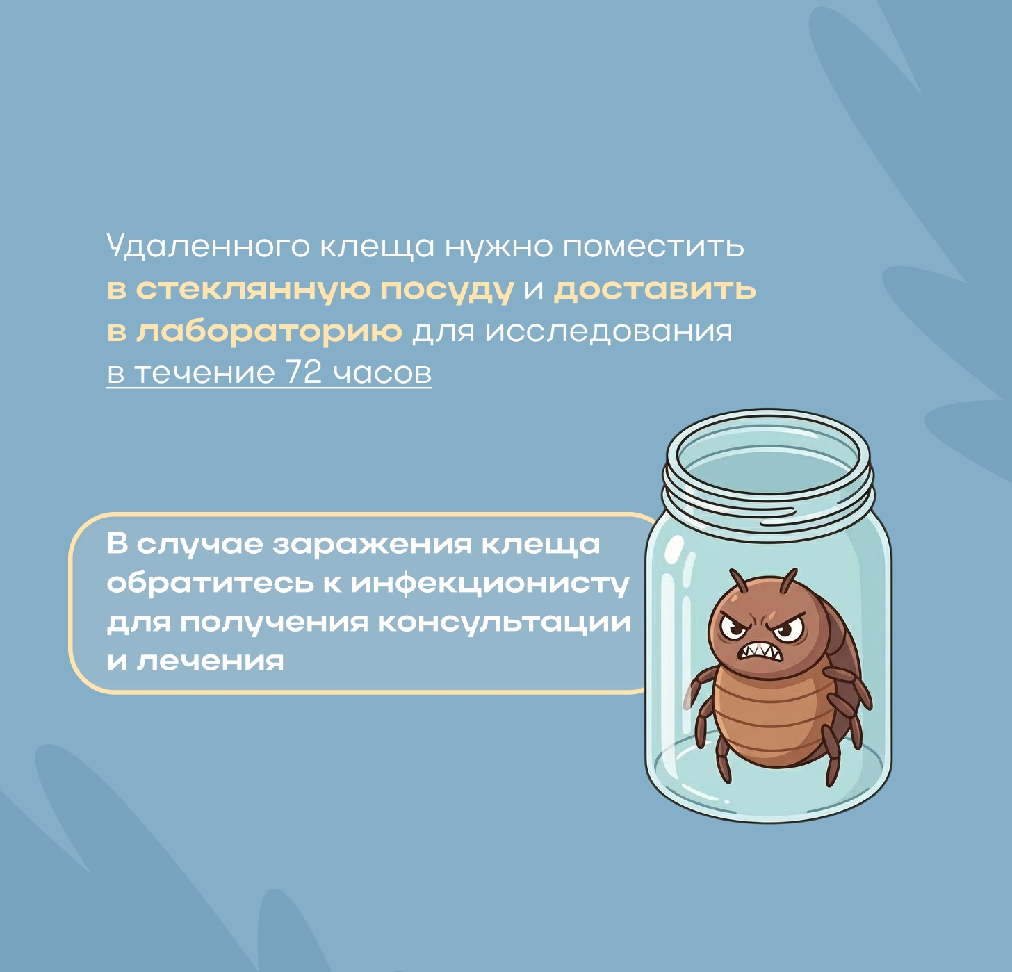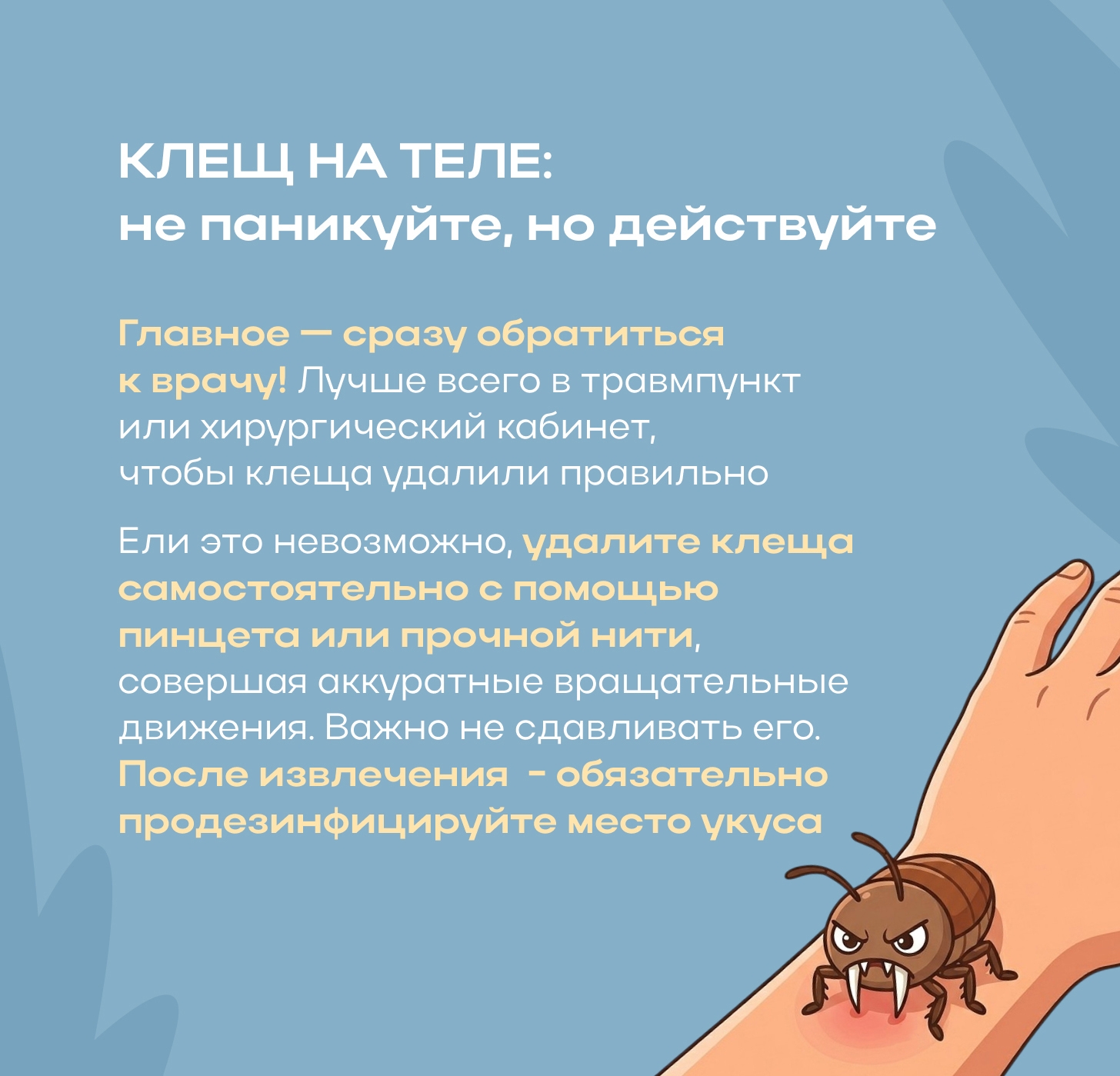 5. Регулярно (каждые 15–30 минут) проводите само‑ и взаимоосмотры во время прогулки и сразу после возвращения домой. 6. Рассмотрите возможность вакцинации против клещевого энцефалита (проконсультируйтесь с врачом).