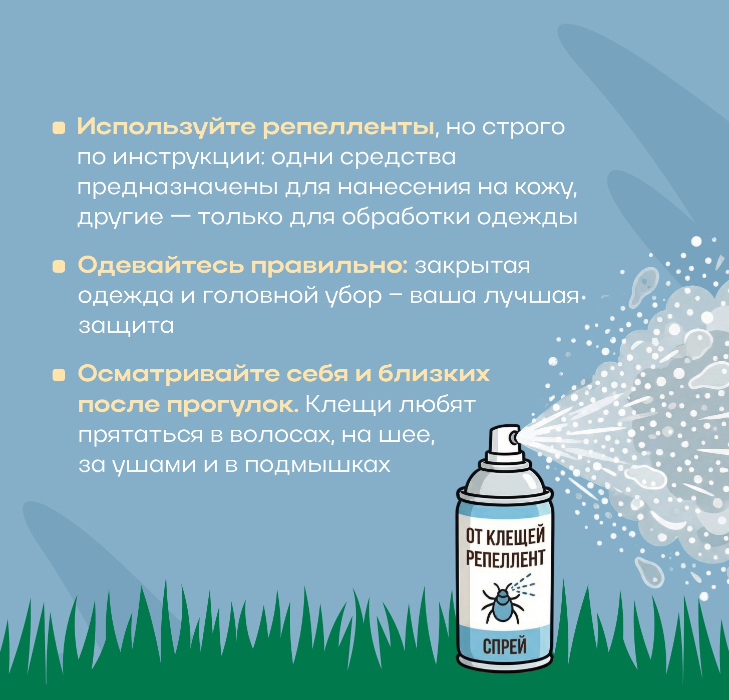 3. Используйте репелленты с пометкой «от клещей», нанося их на одежду и открытые участки тела (согласно инструкции).
