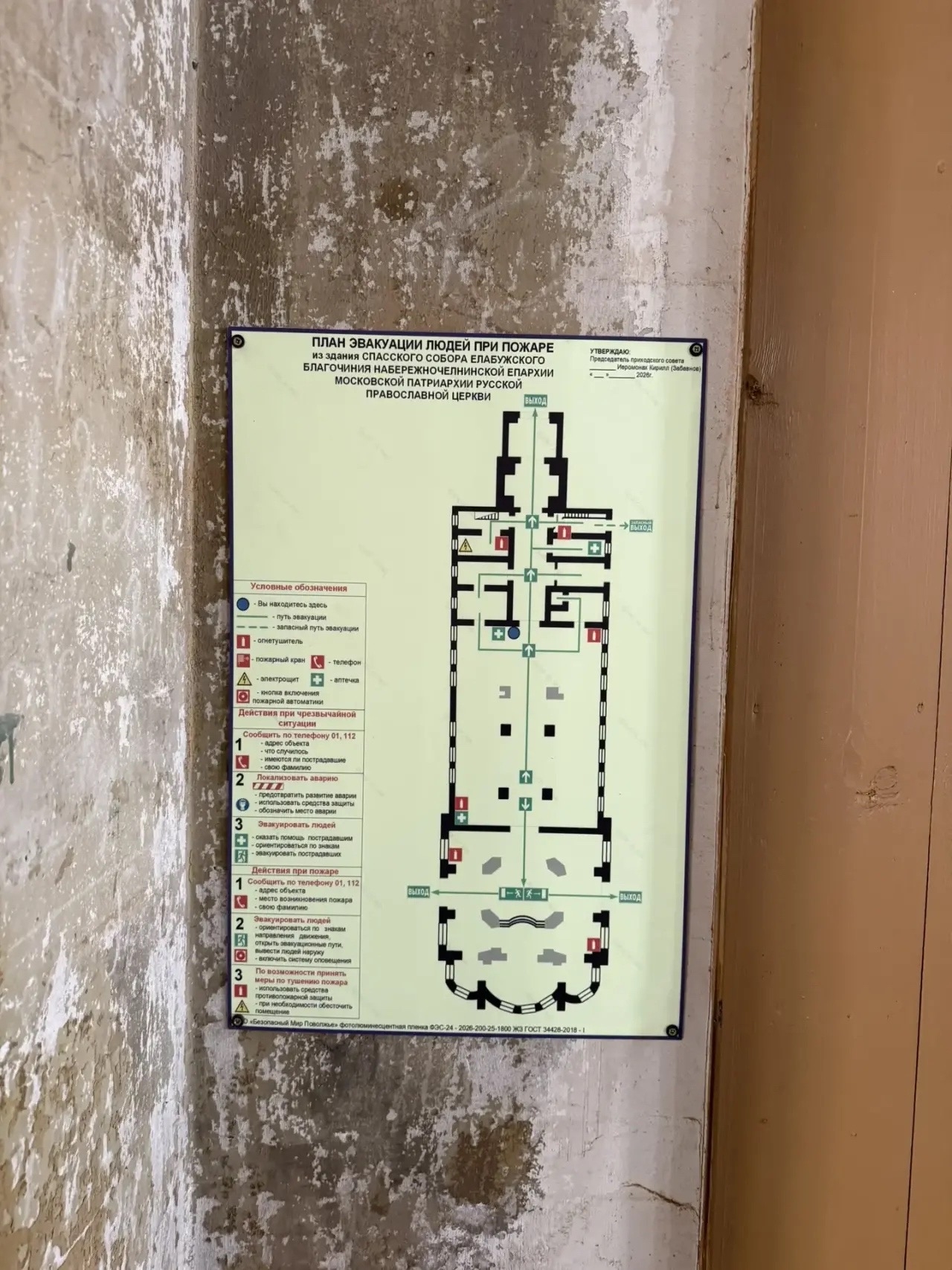 - актуальные планы эвакуации — размещены на видных участках, содержат понятную схему выходов и инструкции для церковнослужителей и прихожан;