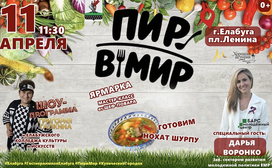 В Елабуге продолжается популярный гастрономический фестиваль «Пир в мир». И в ближайшую субботу гостей ждёт новое кулинарное событие. Ждём вас 11 апреля в 11:30 на площади Ленина. Специальным гостем праздника станет заведующая сектором молодежной политики Дарья Воронко