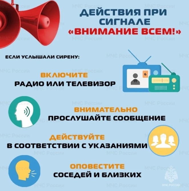 При сигналах сирен нужно дождаться разъяснений причины сигнала из громкоговорителей или включить средства телерадиовещания для прослушивания экстренного сообщения. В нем расскажут об обстановке, мерах безопасности и порядке действий. Сообщение может повторяться несколько раз. Также рекомендуется проверить, есть ли на смартфоне сообщение от РСЧС и уведомление от мобильного приложения «МЧС России».