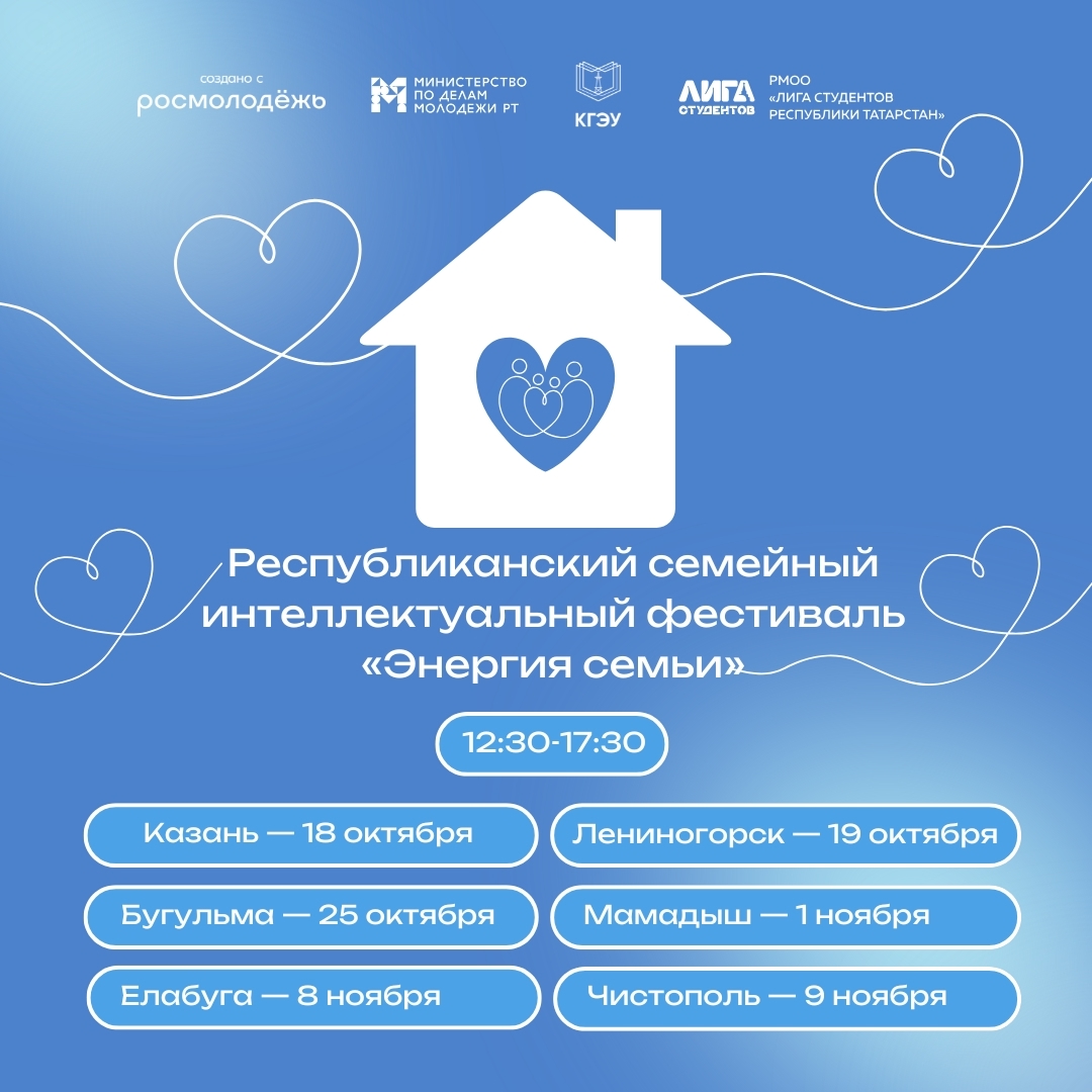 Балалы гаиләләрне «Гаилә энергиясе» республика гаилә интеллектуаль фестивалендә катнашырга чакырабыз. Фестивальнең сайлап алу этаплары Татарстанның 6 шәһәрендә узачак: Казан, Лениногорск, Бөгелмә, Мамадыш, Алабуга һәм Чистай. Бер командада ким дигәндә 2 гаилә әгъзасы катнаша: ата-ана һәм 6 яшьтән 14 яшькә кадәрге бала.