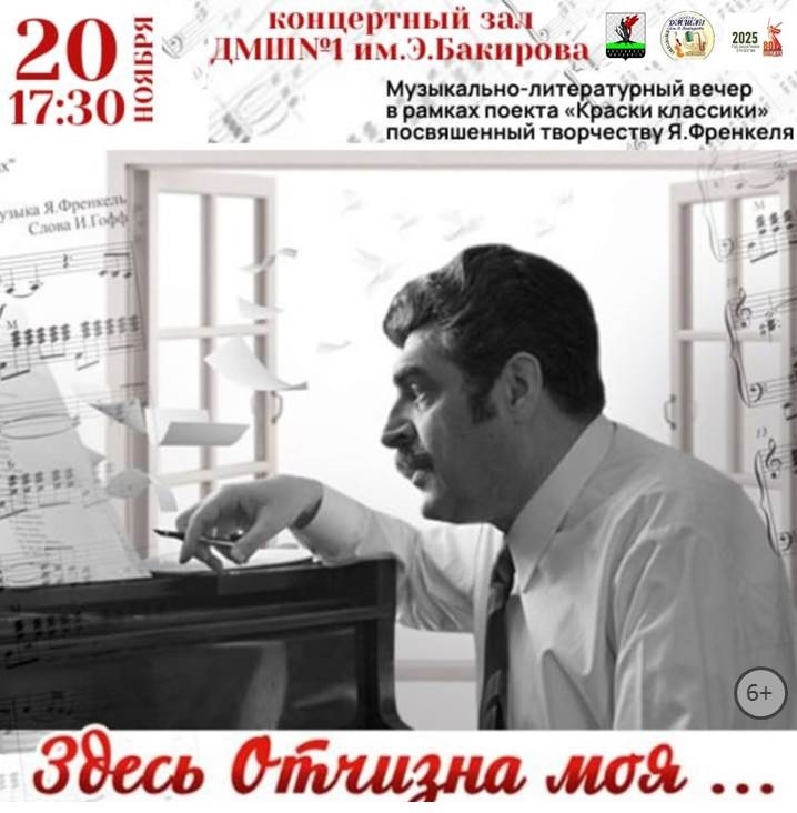 20 ноябрьдә 17.30 сәгатьтә Ә.Бакиров исемендәге 1нче номерлы Балалар музыка мәктәбендә "Классика буяулары" мәгърифәтчелек проектының чираттагы иҗади кичәсе уза. Чараның төп темасы композитор Я.Френкель иҗатына бәйле, аның тууына 105 ел 21 ноябрьдә билгеләп үтелә.