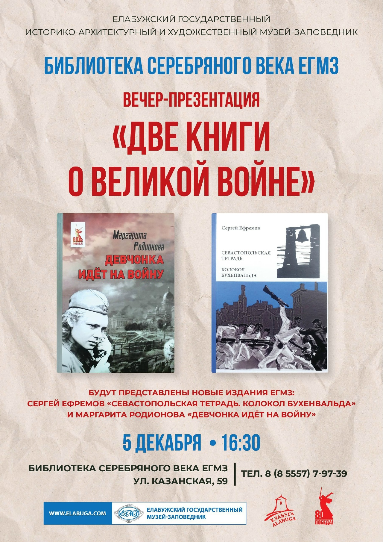 Бу җомга көнне, 5 декабрьдә сәг. 16.30 барыгызны да "Бөек сугыш турында ике китап"ны тәкъдир итү кичәсенә чакырабыз. Бөек Җиңүнең 80 еллыгы елында Алабуга дәүләт музей-тыюлыгы язучы-фронтовик Сергей Еремовның "Севастополь дәфтәре" һәм " Бухенвальда кыңгырау " әсәрләрен, шулай ук Маргарита Родионованың "Кызлар сугышка бара" легендар повестен яңадан бастырып чыгарды.