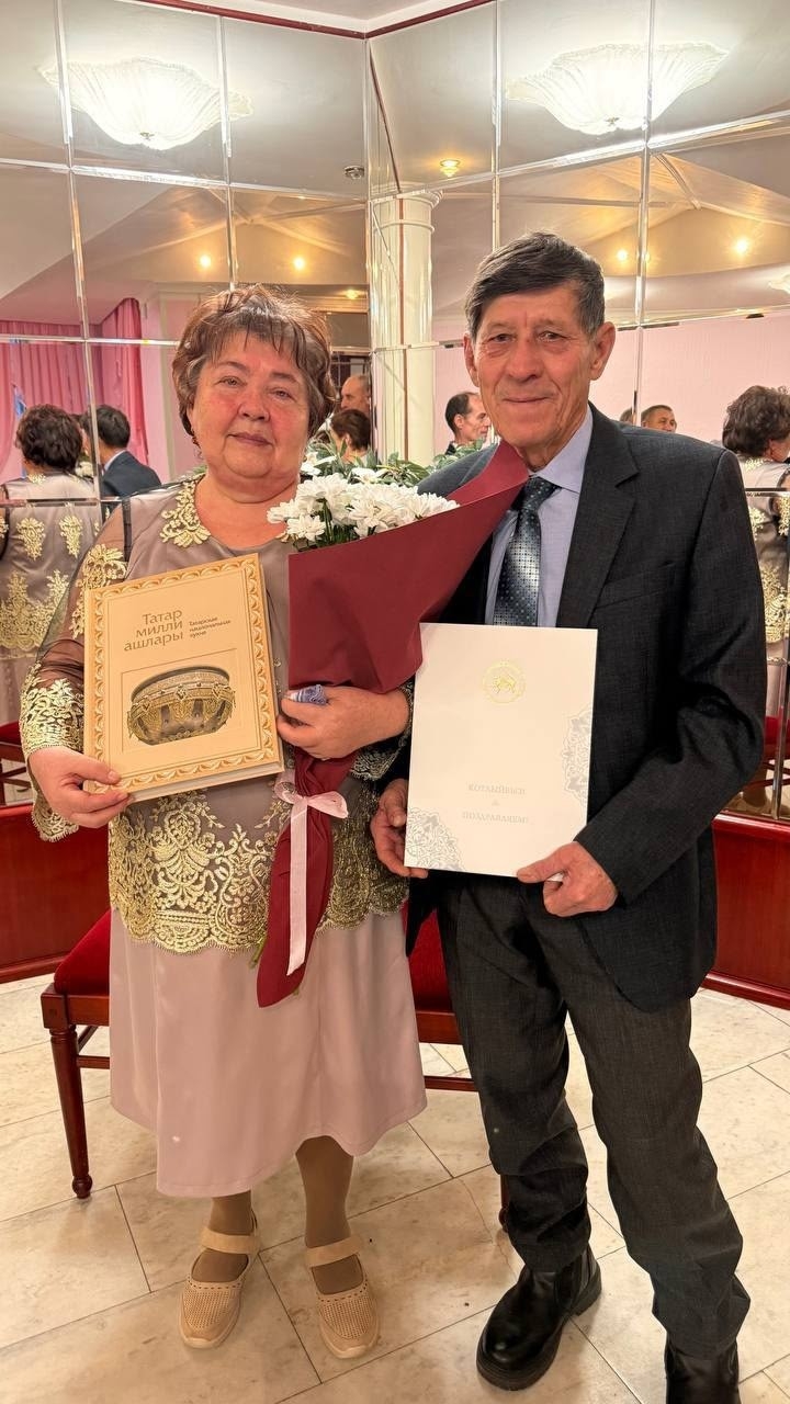 Бу бәйрәм көнендә ЗАГС хезмәткәрләре юбилярларга мактау таныклыгы һәм истәлекле бүләк тапшырдылар.