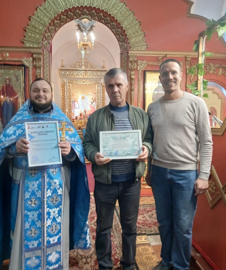 Бүләк Махсус хәрби операция зонасының хәрби хезмәткәрләренә һәм тыныч халкына гуманитар ярдәм җыюны оештырган һәм уздырган цчен тапшырылды. Мактау грамотасын Спас соборы настоятеле иеромонах Кириллга (Забавновка) Алабуга шәһәр волонтерлык хәрәкәте вәкиле Роман Епанешников 7 декабрьдә литургия тәмамланганнан соң тапшырды.