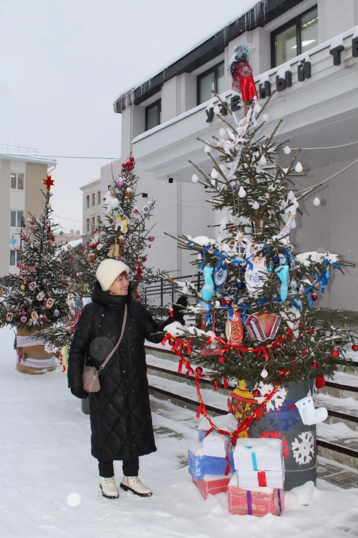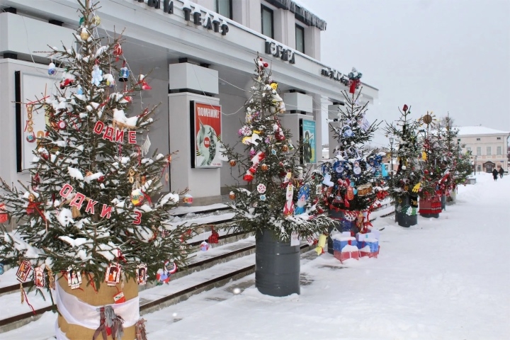 «Кама» укыту театры каршындагы мәйданчыкта Алабуга районында яшәүче җиде төп халыкның милли колориты белән бизәлгән җиде яңа ел чыршысы урнашкан. Проект – учреждениеләрне иң яхшы бизәү конкурсында җиңүче.