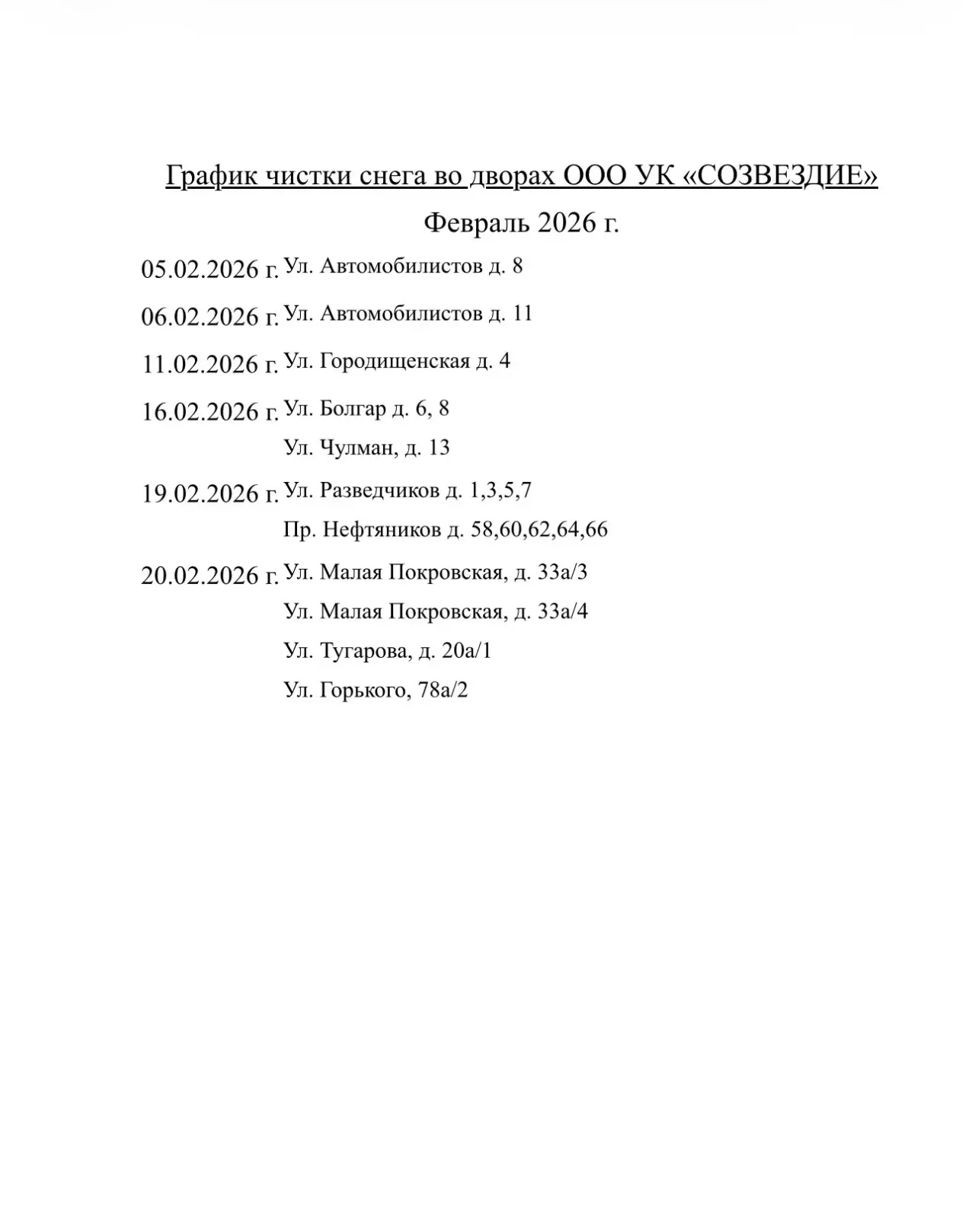 Алабугада шәһәр һәм район юлларында кар чистарту эшләре дәвам итә. Көн саен ике дистәдән артык техника кар җыештыру белән шөгыльләнә - юлларны һәм тротуарларны чистарта. Ишегалларында карны идарәче компанияләр хезмәткәрләре тазарта. Халыкка уңайлы булсын өчен "Созвездие" һәм "Домуправ-3" идарәче компанияләреннән кар чистарту графигын бастырабыз.