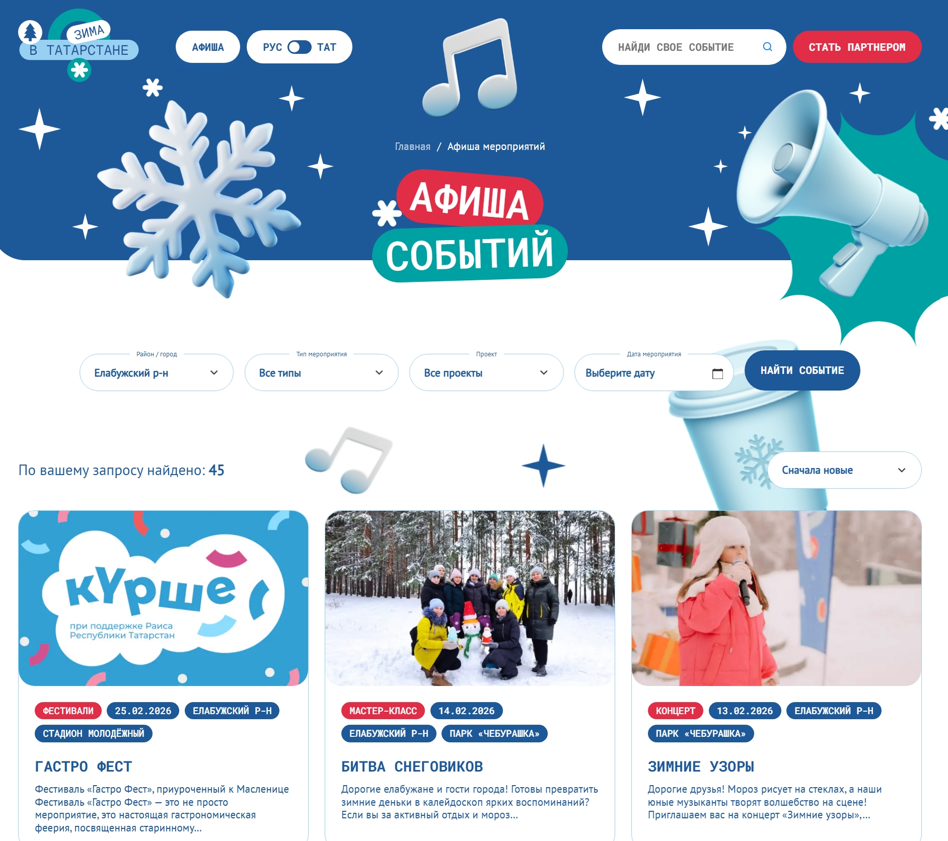 Татарстанда кыш-ул матур вакыйгалар һәм кабатланмас тәэсирләр чоры. Сезне бәйрәмнең бер өлеше булырга чакырабыз! zima.tatar проектының рәсми сайтында сезне вакыйгаларның тулы афишасы көтә: концертлар, фестивальләр, спорт ярышлары, күргәзмәләр һәм шәһәрнең уңайлы активлыклары. Биредә сез һәр чараның даталары, вакыты һәм программасы турында тулы мәгълүмат табарсыз.