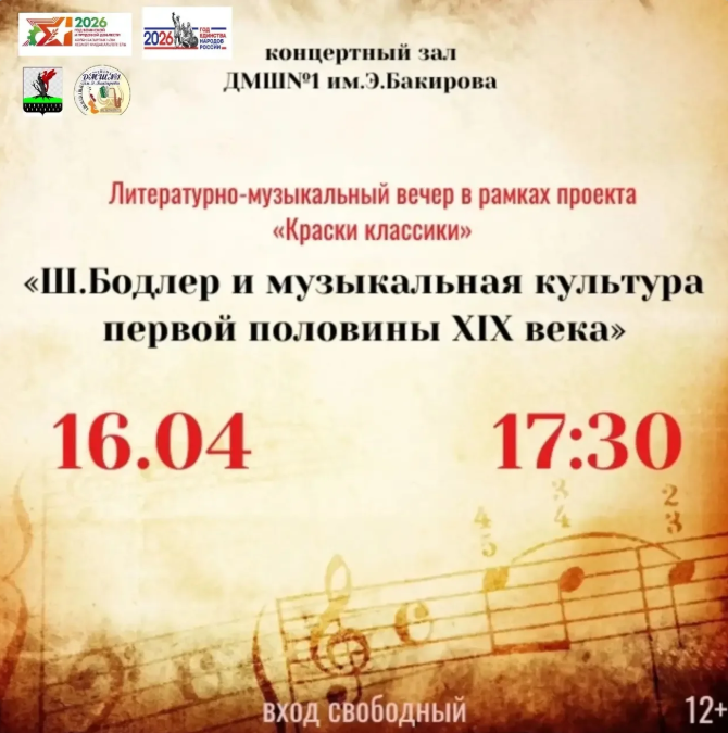 Сәнгать сөючеләрне «Классика буяулары» проекты кысаларында узучы тагын бер очрашуга чакырабыз! 16 апрель көнне 17: 30 сәгатьтә Ә. Бакиров исемен йөртүче 1нче Балалар музыка мәктәбендә концерт уза. Яңа әдәби-музыкаль кичә чит ил сәнгатенә багышлана һәм Шарль Бодлер поэзиясенең XIX гасырның беренче яртысына караган музыка сәнгате белән гаҗәеп бәйләнешен ачачак.
