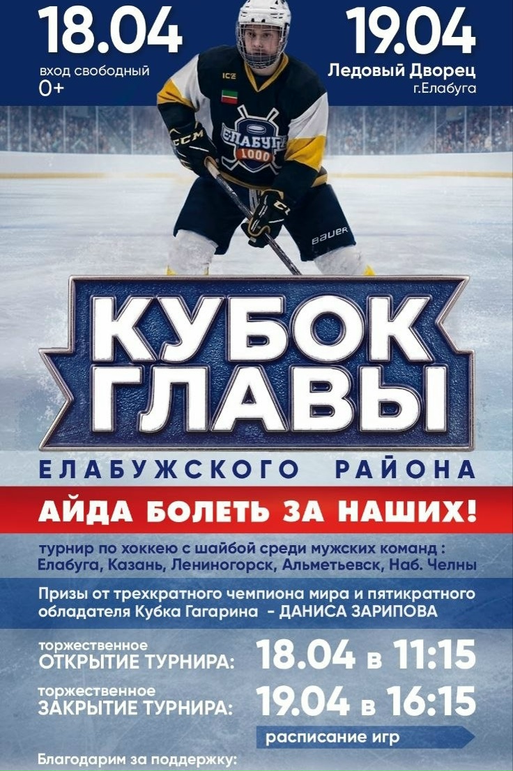 18 һәм 19 апрельдә Алабуганың Боз сараенда күңелле спорт вакыйгасы – хоккей буенча Алабуга районы башлыгы кубогы уза. Тамашачыларны биш шәһәрдән килгән ир-атлар командалары арасында кызыклы матчлар һәм киеренке көрәш көтә. Турнирда Алабуга, Казан, Лениногорск, Әлмәт һәм Яр Чаллы коллективлары катнашачак. Командалар иң көчлеләр исеме өчен генә түгел, ә өч тапкыр дөнья чемпионы һәм биш тапкыр Гагарин Кубогы иясе Данис Зариповтан кыйммәтле призлар өчен дә көрәшәчәк.